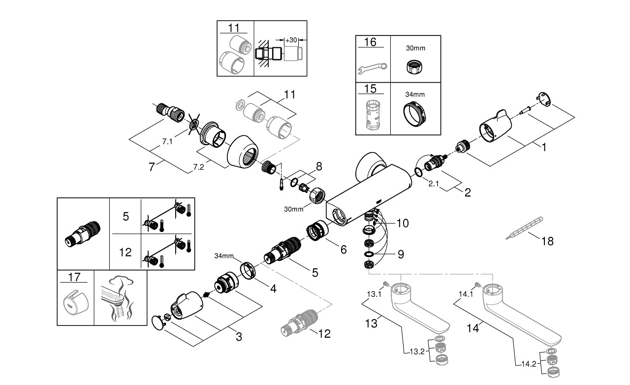 Pos. No. Prod. Beschreibung 1 Shut-off handle 2 Seramik salmastra, 1/2" 2.1 O-ring Ø18,2 x Ø1,7 3 GRT Special sıcaklık kontrolü kolu 4 Montaj halkası 5 Termostatik kompak kartuş 1/2 6 UK 7 Ekzantrik 7.1 conta 7.2 Europlus Banyo Bataryası Rozeti 8 çek valf 9 Izolasyon contasi 10 stop vida 11 Uzatma-seti 30 mm 12 GROHE TurboStat kartuş 1/2" 13 Döküm döner çıkış ucu 14 Döküm döner çıkış ucu 15 Soket anahtarı 16 özel anahtar 17 Sıcaklık kilidi kaldırır kol 18 Ayarlama Termometres, (°C) Özellikler